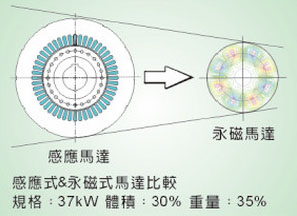 馬達(dá)使用永磁型轉(zhuǎn)子,不須通過電流製造磁場(chǎng)除耗能更低外,電機(jī)內(nèi)部產(chǎn)生廢熱也減少,散熱需求面積減少,馬達(dá)體積減少30%,重量減輕35% |